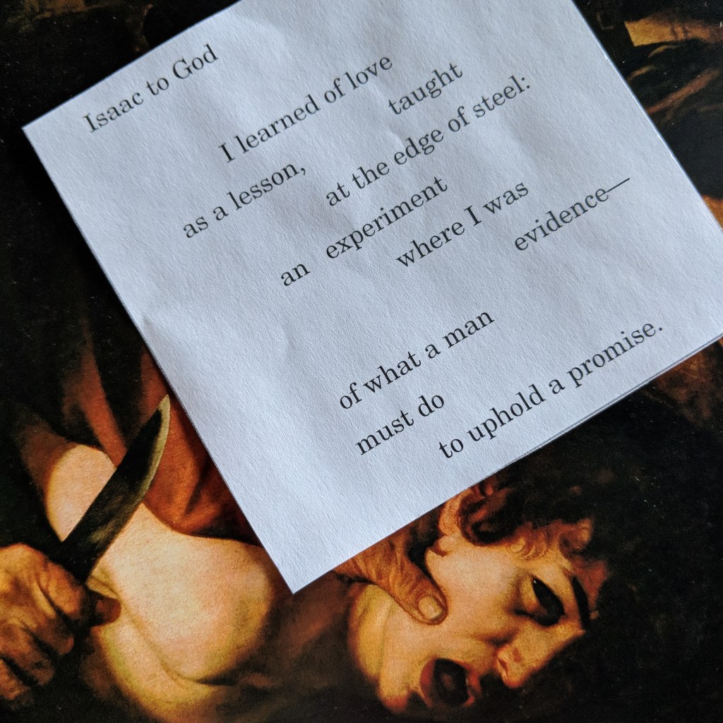 Isaac/ Caravaggio Posted bypostpoeticalDecember 16, 2020December 20, 2020Posted inUncategorized PoemsTags:caravaggio, Isaac, sacrifice Originally posted January, 2019 Isaac to God I learned of loveas a lesson, taught at the edge of steel: an experimentwhere I was evidence —of what a manmust do to uphold a promise. Like Loading... Related