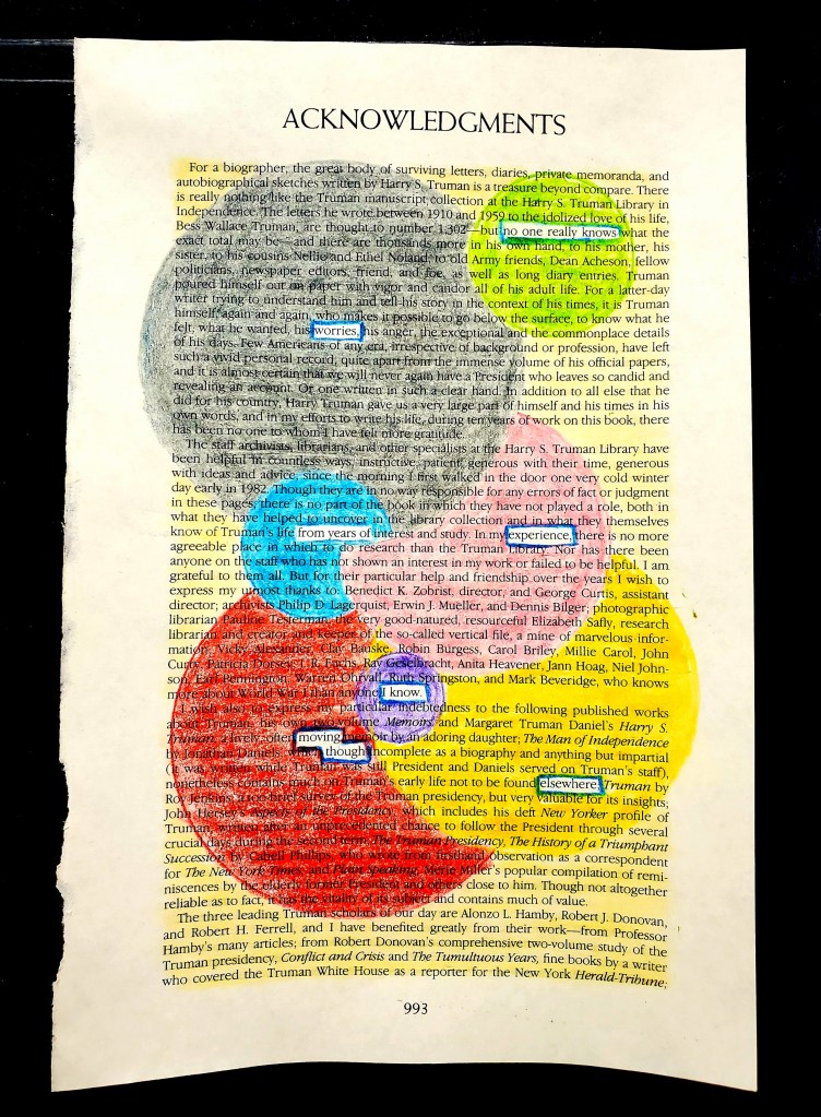 Acknowledgements Posted bypostpoeticalDecember 17, 2020December 20, 2020Posted inAltered Book Pages, PoemsTags:Truman No one really knowsworriesfrom years ofexperience,moving throughelsewhere:I know. Share this: Click to share on X (Opens in new window) X Click to share on Facebook (Opens in new window) Facebook Like Loading... Related