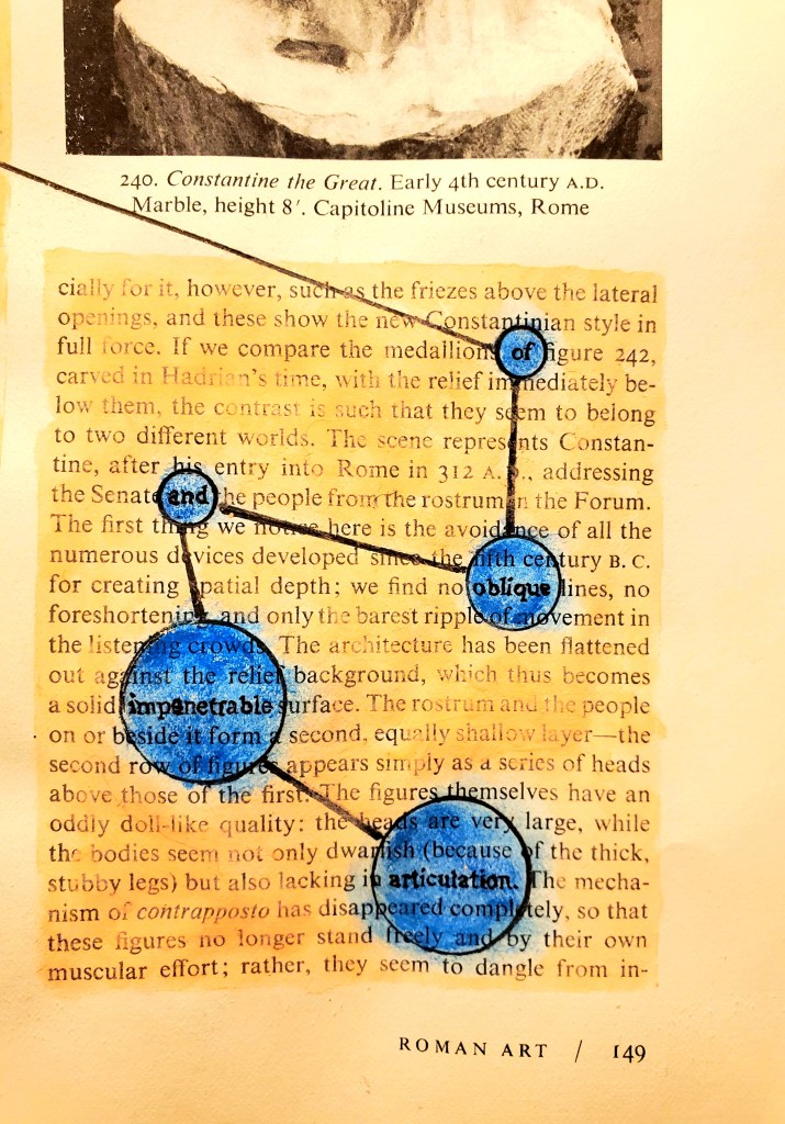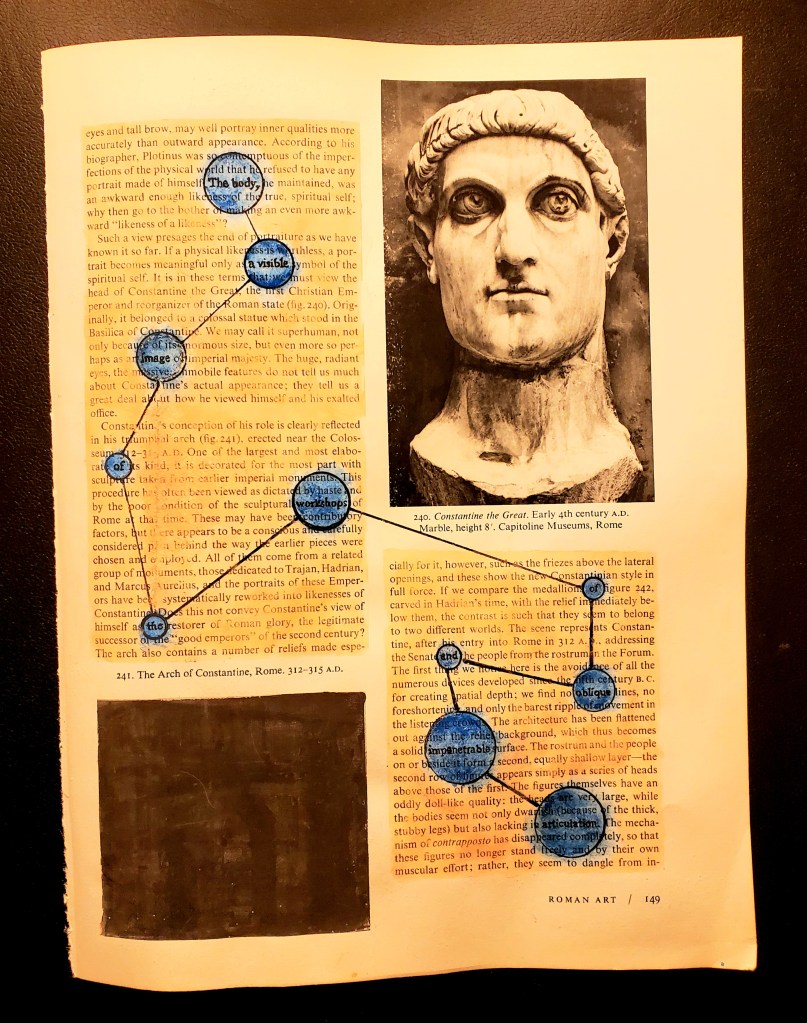 The body Posted bypostpoeticalJanuary 2, 2021January 4, 2021Posted inAltered Book PagesTags:altered book, body, Humument, oblique, roman art a visible image of the workshops of oblique and impenetrable articulation. For more Altered Book Pages, click here: https://postpoetical.com/altered-book-pages/ Share this: Click to share on X (Opens in new window) X Click to share on Facebook (Opens in new window) Facebook Like Loading... Related